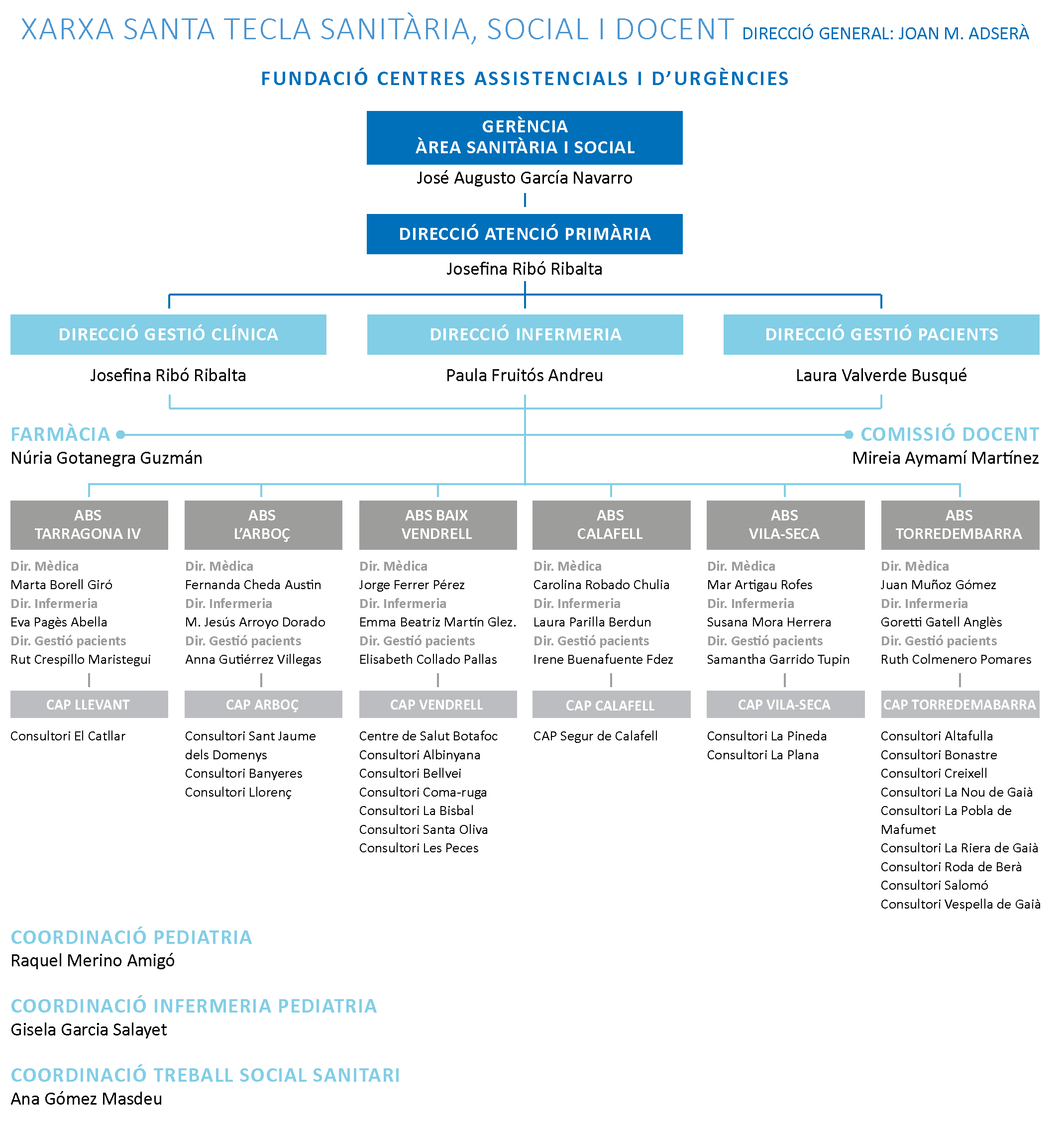 La Fundació Centres Assistencials i d'Urgències està integrada dins de la Xarxa Santa Tecla i es divideix en 6 Àrees Bàsiques de Salut, cadascuna amb el seu coordinador/a mèdic/a i cordinador/a d'infermeria: