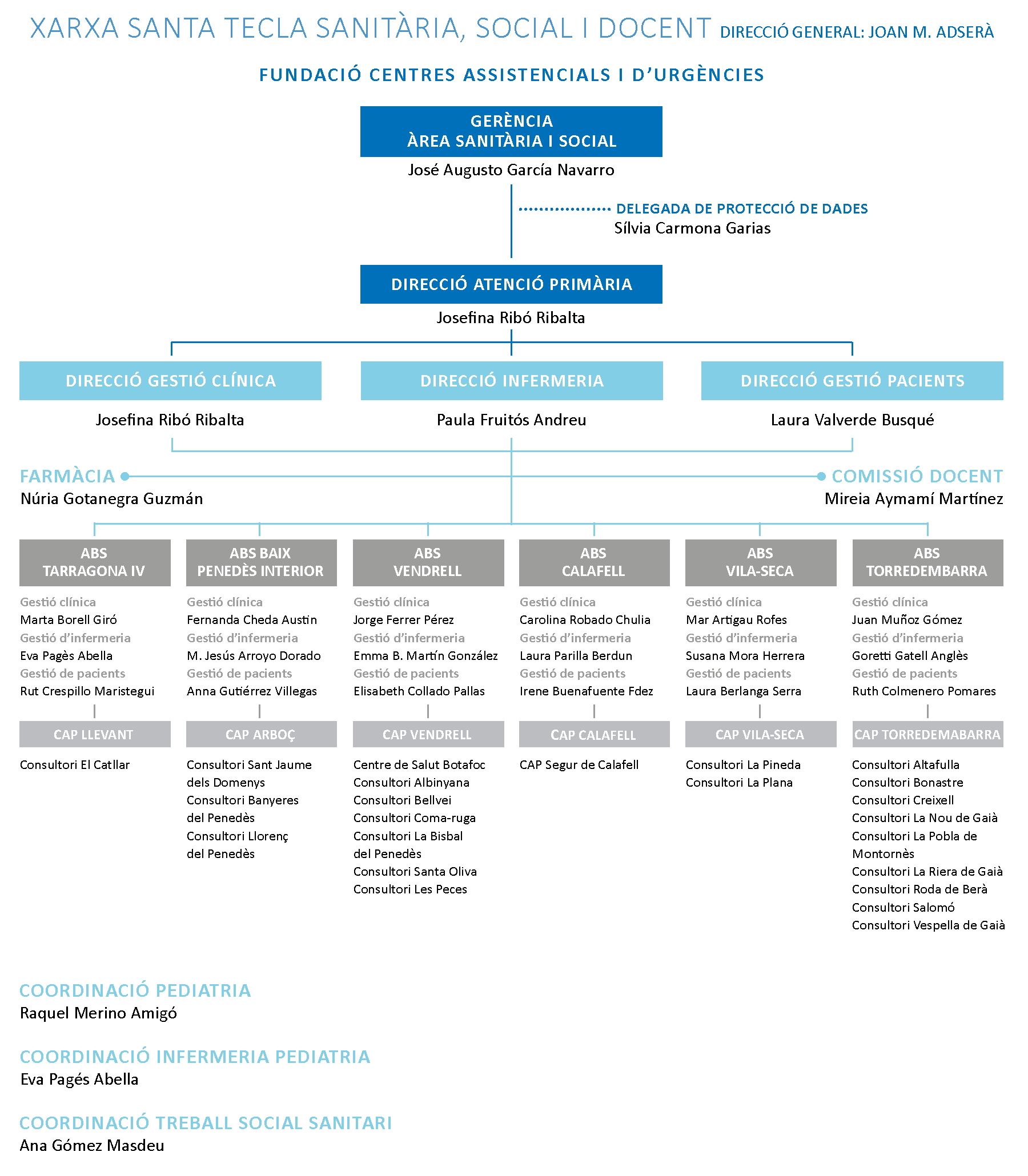 La Fundació Centres Assistencials i d'Urgències està integrada dins de la Xarxa Santa Tecla i es divideix en 6 Àrees Bàsiques de Salut, cadascuna amb el seu coordinador/a mèdic/a i cordinador/a d'infermeria: